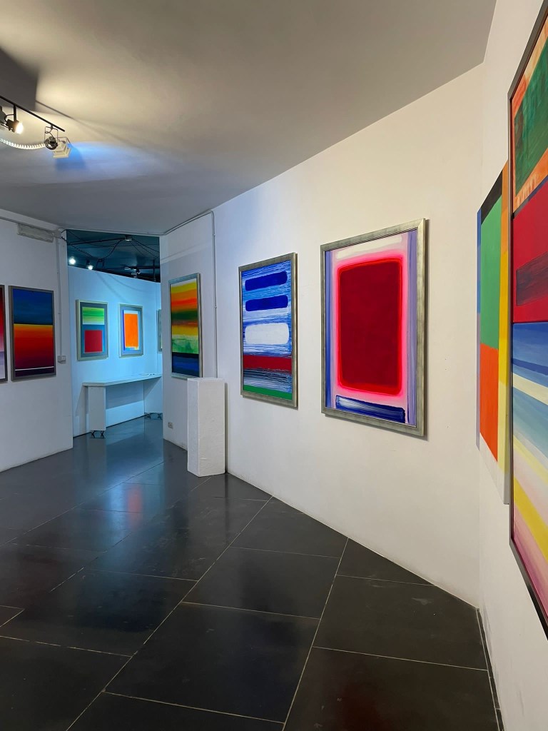 La cosa che salta subito all’occhio quando si guardano le sue opere sono sicuramente i colori brillanti e sgargianti che ha utilizzato. Quale è il suo rapporto con i colori? In effetti, come lo detto nella precedente risposta, il colore è l’oggetto del mio studio e del mio lavoro, ecco perché ho realizzato questa serie di opere che ho esposto a Roma tutta dedicata all’effetto della luce sul colore.